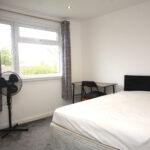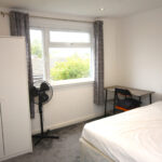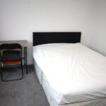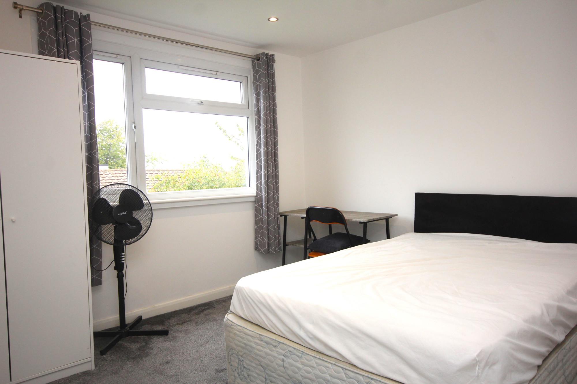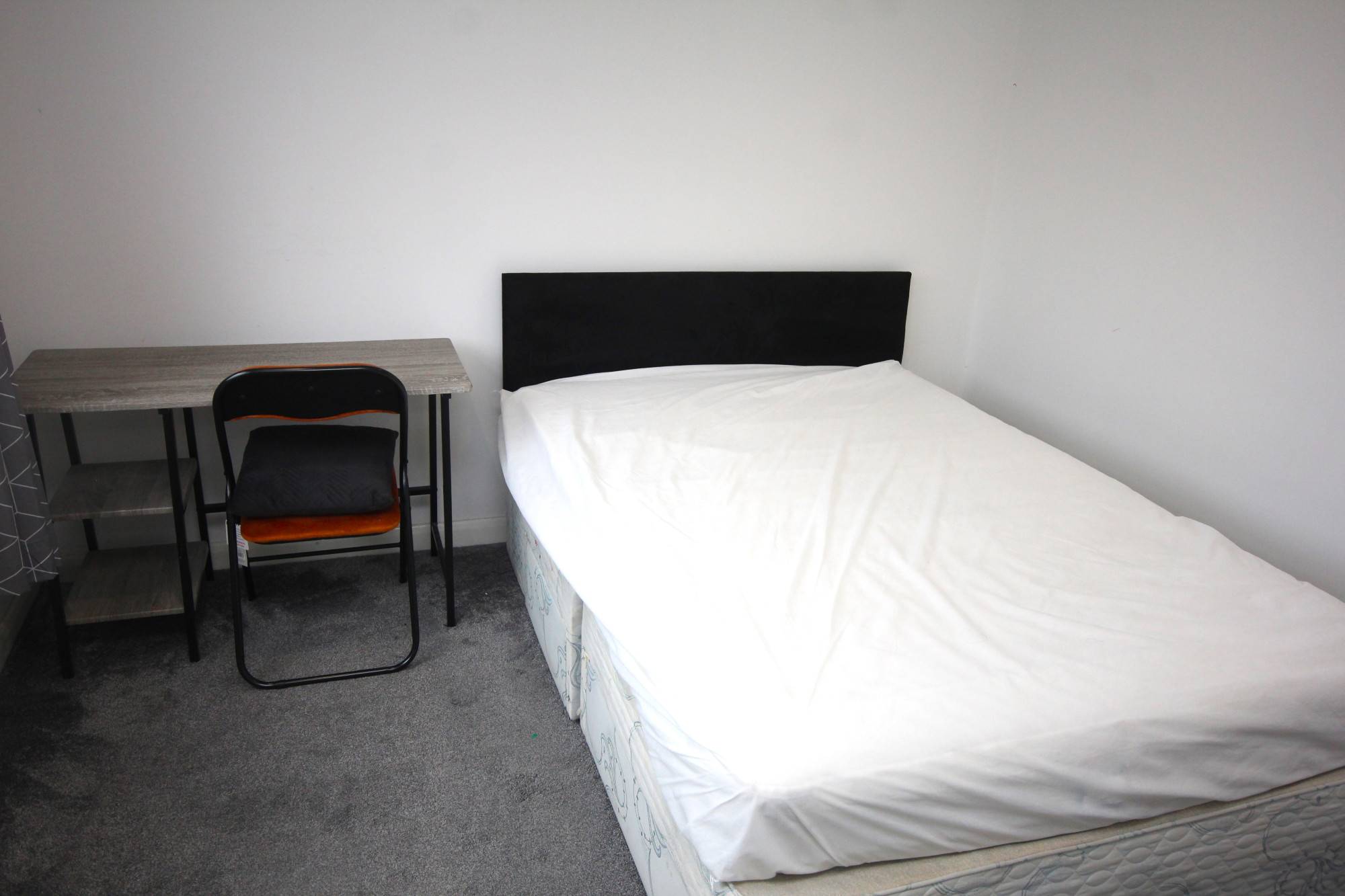 Furnishings include: Double bed with mattress/protector, 2 x wardrobes (one in storage room), floor standing fan, curtain poles & curtains, micowave, free-standing fridge/freezer, desk & chair in bedroom, 2x fold-away desks/chairs in storage room, vacuum cleaner, bucket/mop.