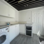 Kitchen - Matching wall and base units with rolled over edge work surface, washing machine, electric oven/hob and freestanding fridge. Access to the rear.