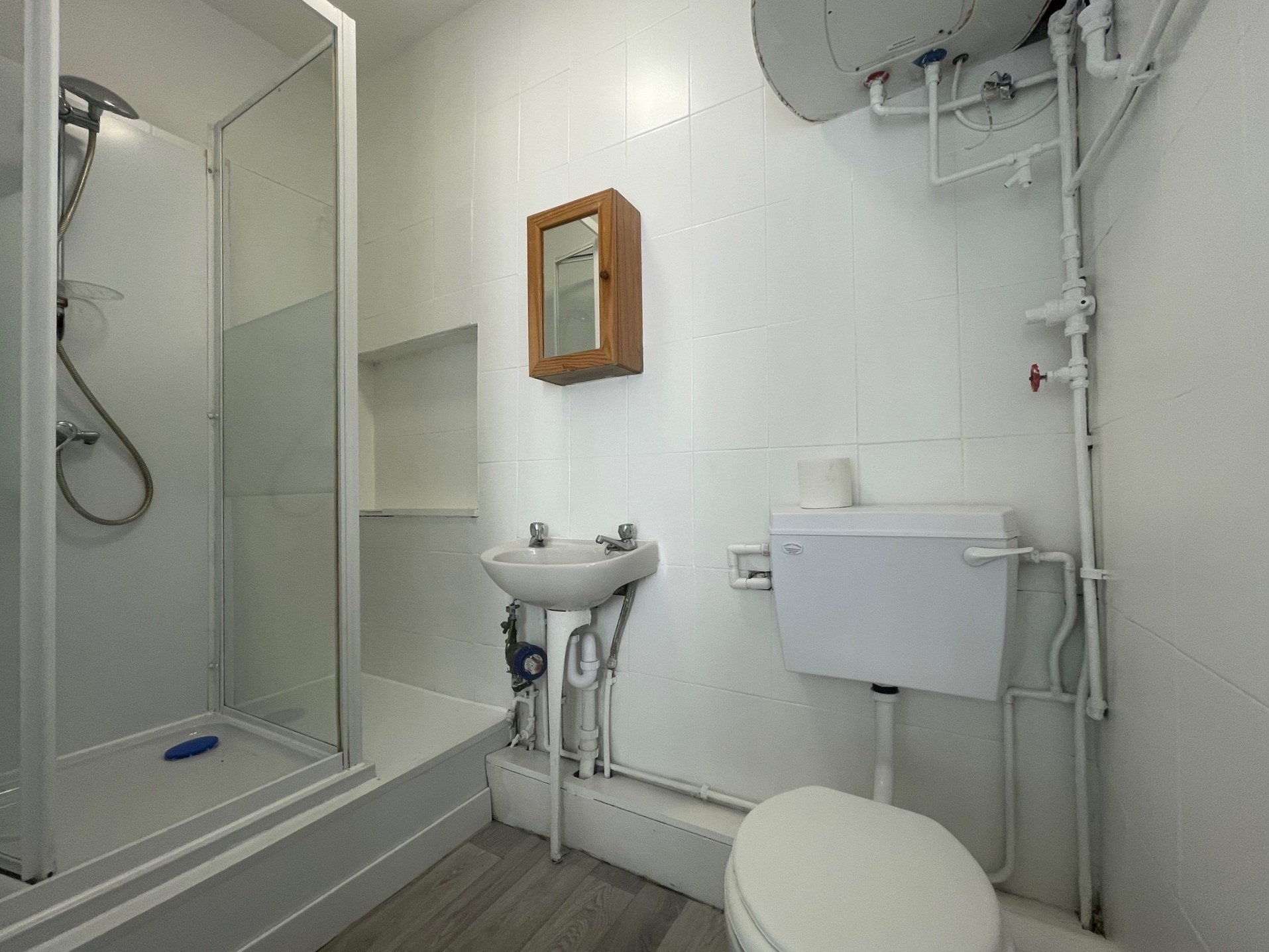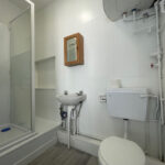 Shower Room - Low level WC, pedestal wash hand basin and shower cubicle. Partially tiled walls, mirror and medicine cabinet.